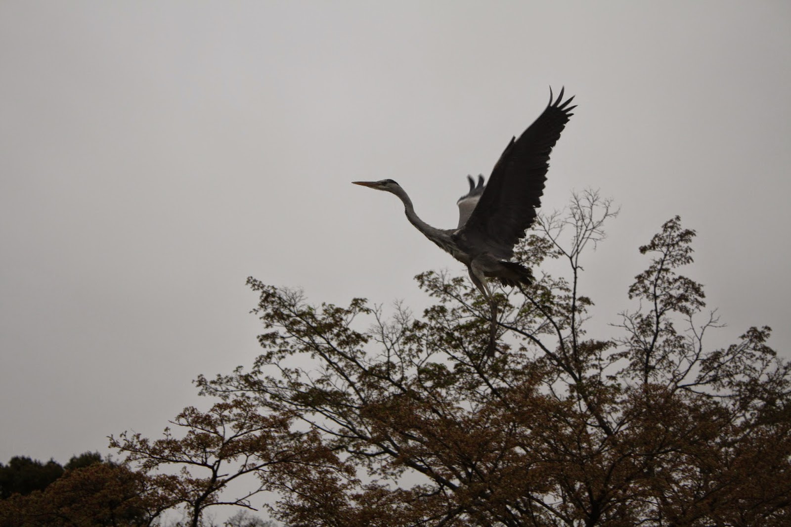 On my way through Himeji, bright and early, it was lightly misty, the sakura trees were dropping pink petals everywhere, and I saw a couple of interesting things. A heron landed on a tree ahead of me on a path, and I managed to snap it flying away as I approached: